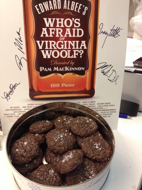 Last week’s Wine and Unwind cookies came to be because of a challenge. Last year, James was working at The Shakespeare Theatre in Washington, DC (winner of the 2012 Tony Award for Regional Theater!) stage managing a production of Two Gentlemen of Verona. Across the street from the loading dock in the back is a wonderful tea emporium and restaurant called Teaism. Serving a variety of teas as well as bento boxes, udon noodles and an amazing salted chocolate oatmeal cookie, it was a favorite lunch stop for the cast and crew. The actress Natalie Mitchell, who played Silvia, challenged James to make his own version of the cookie. It took a couple of tries, but James thinks this recipe is closest to theirs.