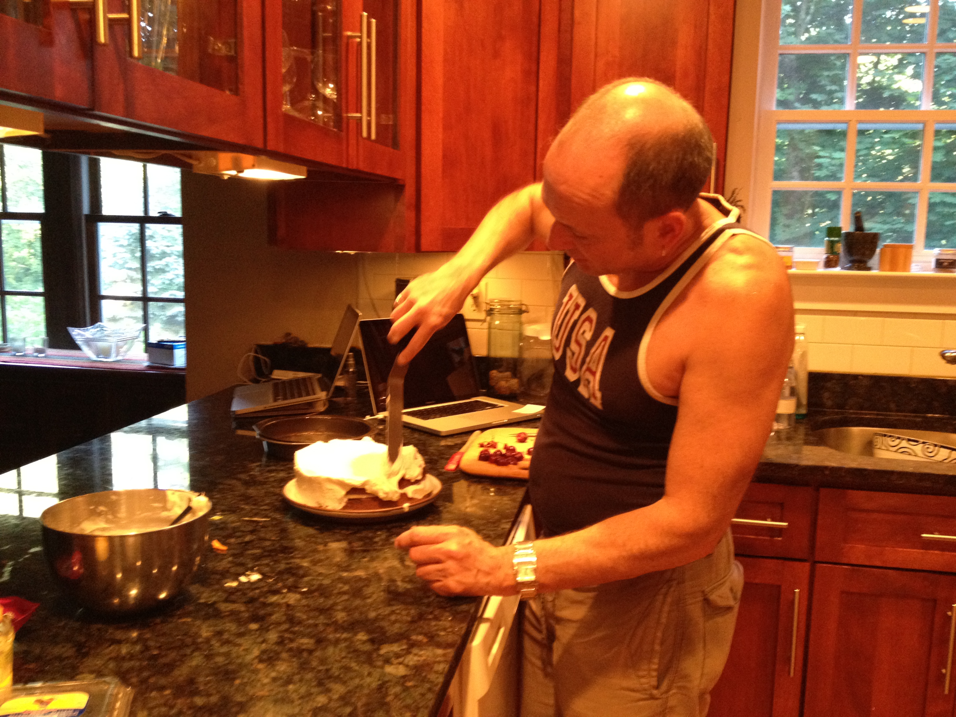 But James saved the day, whipping the cream to perfection, sugaring it with confectioner’s sugar just so, icing the cake with the cream and decorating it with a star made of blueberries and strawberries. What’s not to like??