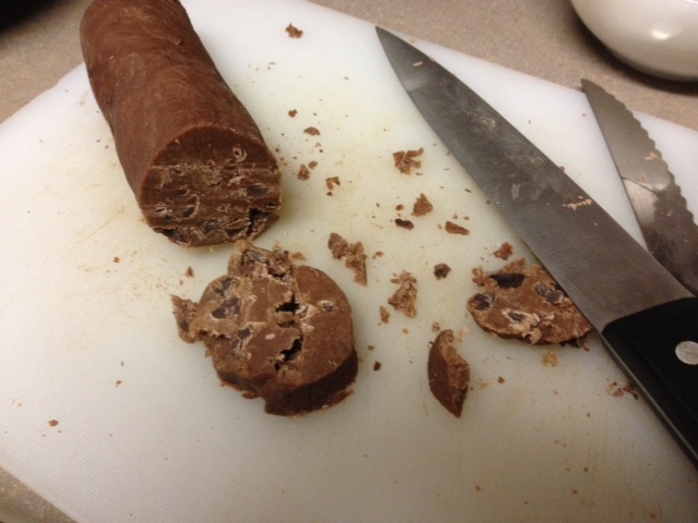3.  Toss in the chocolate pieces and mix only to incorporate. Turn the dough out onto a work surface, gather it together and divide it in half. Working with one half at a time, shape the dough into logs that are 1 1/2 inches in diameter. Wrap the logs in plastic wrap and refrigerate them for at least 3 hours. (The dough can be refrigerated for up to 3 days or frozen for up to 2 months. If you’ve frozen the dough, you needn’t defrost it before baking — just slice the logs into cookies and bake the cookies 1 minute longer.)